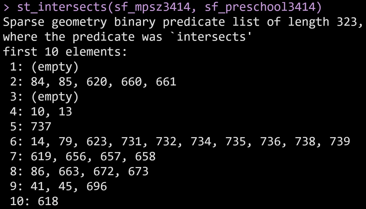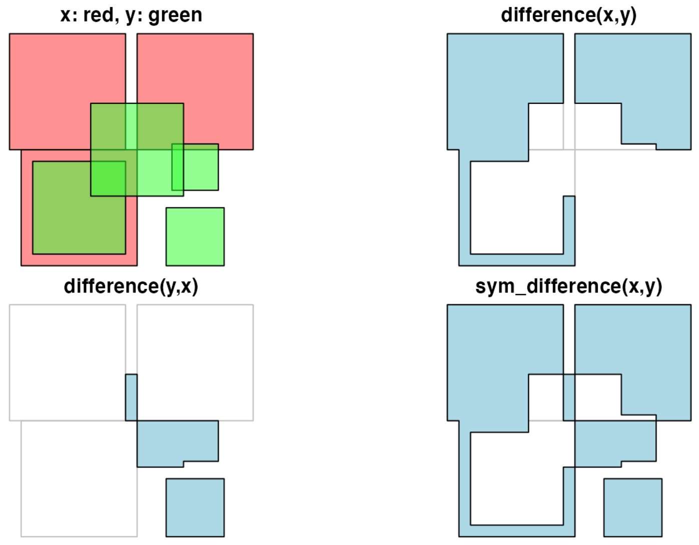 These functions return a logical matrix indicating whether each geometry pair meeting the logical operation.
