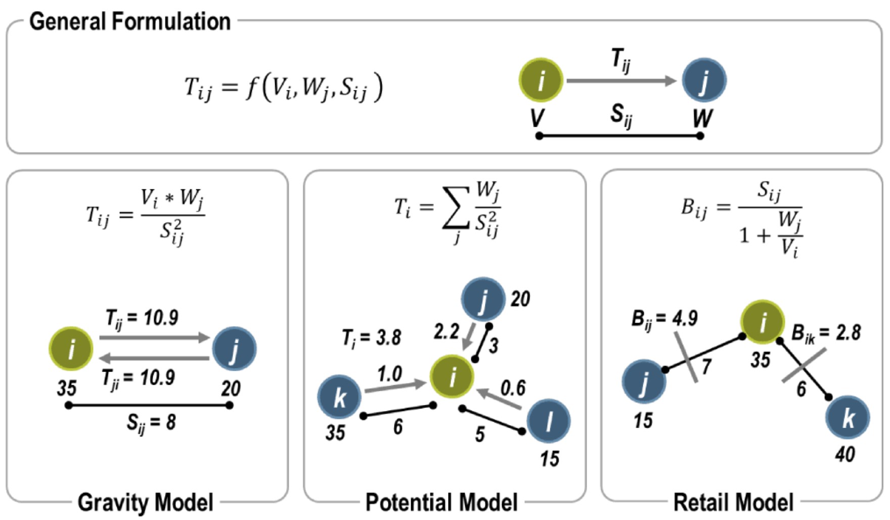 Spatial interaction or βgravity modelsβ estimate the flow of people, material, or information between locations in geographical space.